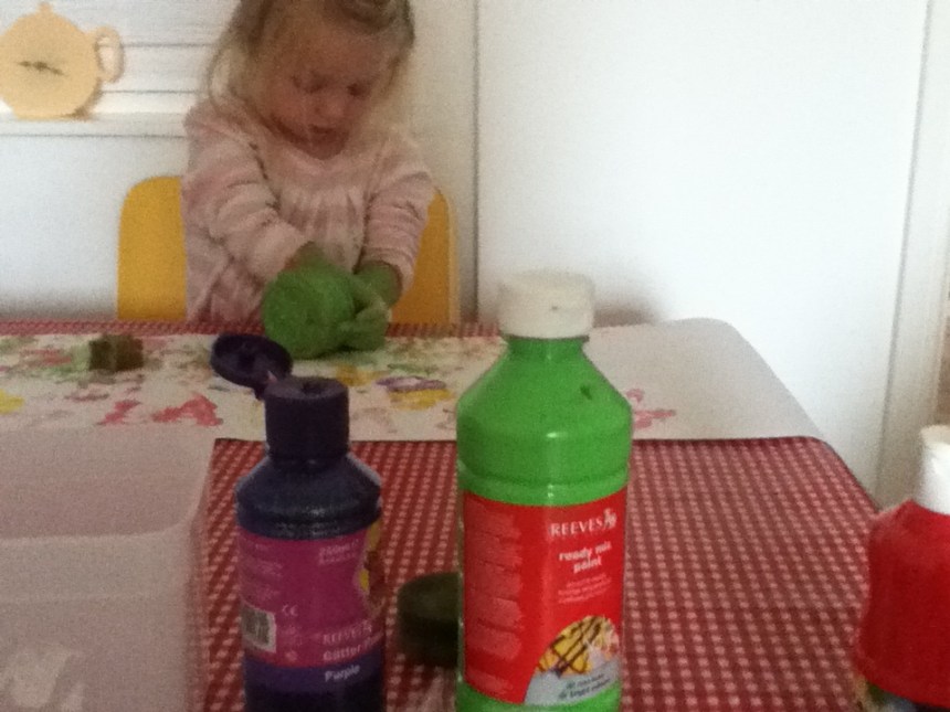 It’s not about creating a masterpiece it’s about learning and discovering. In no way should I put my ideas upon her. 5 minutes in and I’m thinking put that there, use this colour, don’t ruin it !!! . I step away from the table and I try not to look. The outcome is not good – her clothes are messy – the chair and table are covered and a bath is required NOW …. but she is happy. My goal is achieved. I have to confess however the picture below was not created by this method. I helped perhaps a little too much. But hey, I kind of like the result ……a joint effort !