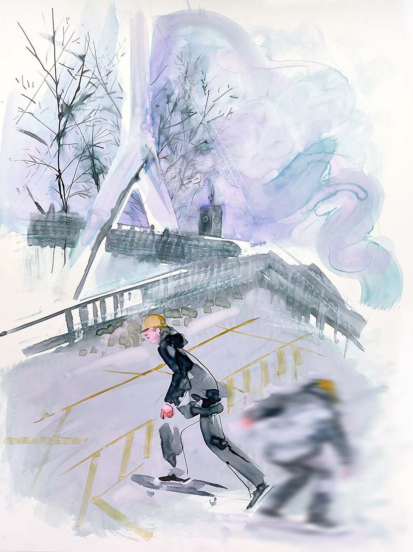 I enjoy experimenting with movement and overlaying inky sketches of the skaters who hang out in Frankwell car park. Their graffiti is particularly poor but something about the sadness of a solo skater attempting unseen tricks in a wet, grey car park appeals to me.