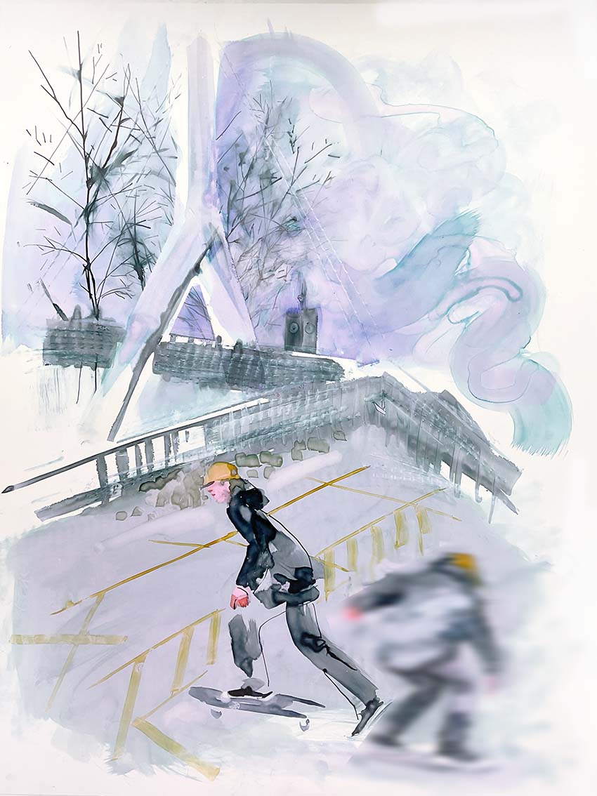 I enjoy experimenting with movement and overlaying inky sketches of the skaters who hang out in Frankwell car park. Their graffiti is particularly poor but something about the sadness of a solo skater attempting unseen tricks in a wet, grey car park appeals to me.